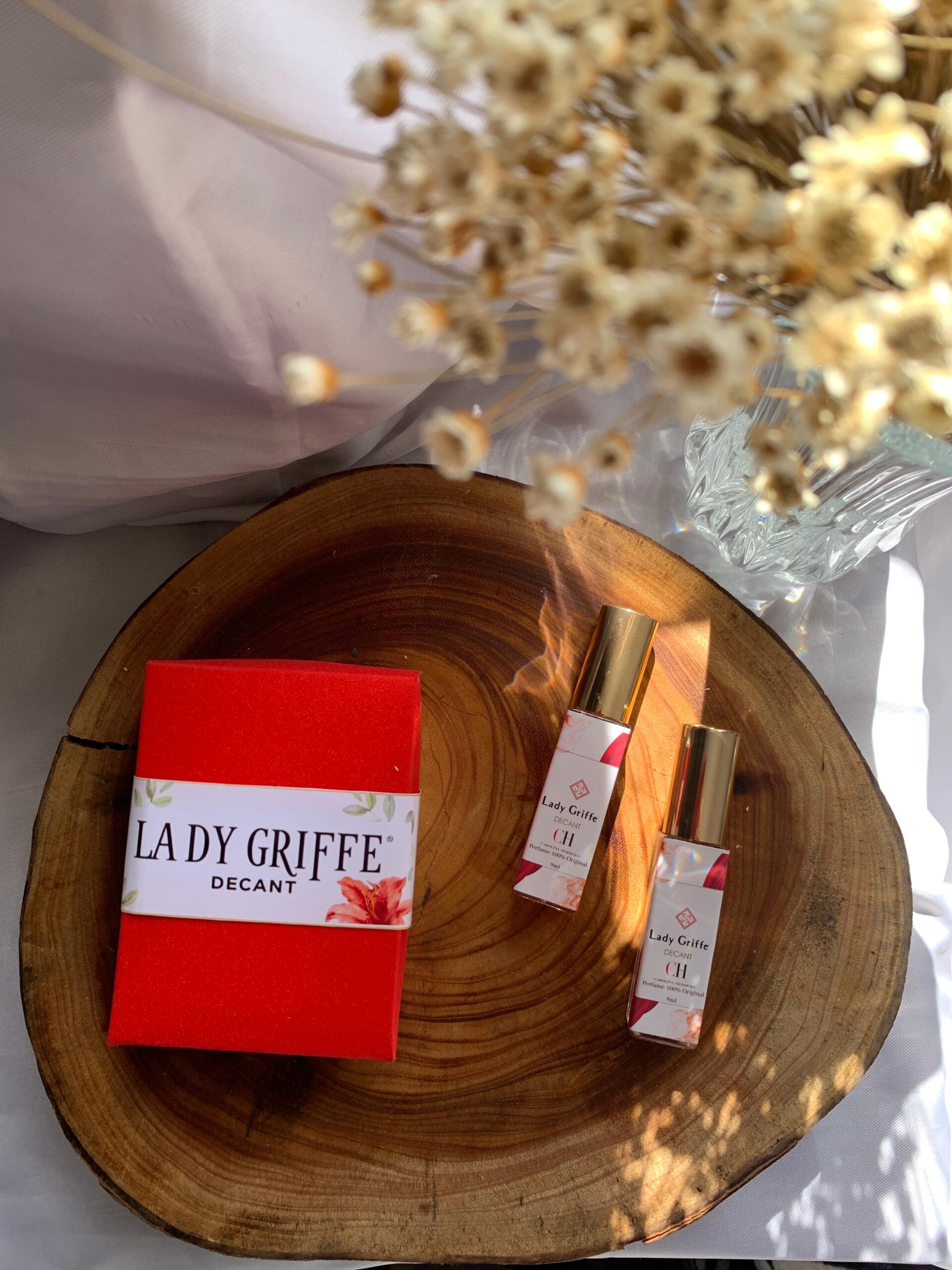 Cada decant chega em embalagem premium, com selo “Produzido por Lady Griffe” e instruções de uso.